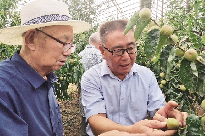 隋建国(右)与农业专家查看冬枣生长情况 ■ 图片由受访者提供